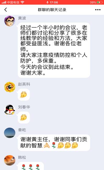 在线英语教学有其自身的局限性,比如,全体师生不能面对面互动,网络有时拥堵不畅,音视频易于卡顿,师生只能键字交流等等。尽管如此种种,绝大部分学生学习态度端正,自觉性和自律性较强,老师们勇于接受挑战,乐于分享交流,相信在线教学能够实现效率效果最大化。本次分享会持续一个半小时,结束之际,大家表示这次会议非常成功,感觉受益匪浅,互相感谢彼此贡献的智慧。
