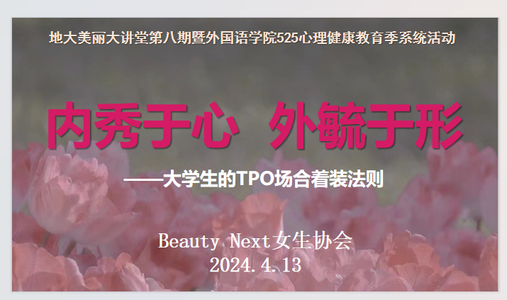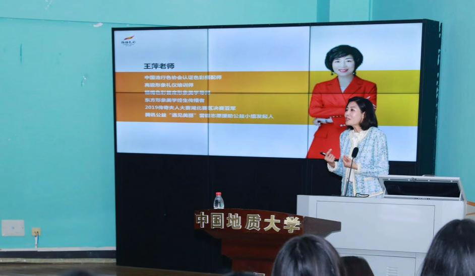 作为外国语学院红外·线大思政课堂审美素养提升的重要载体和“525”心理健康教育季系列活动,由beat365平台官方网站(武汉)beat365平台官方网站主办、Beauty Next女生协会承办的美丽大讲堂第八期“内秀于心 外毓于形”于4月12日下午15:00,在北一楼报告厅正式开讲。本次活动特邀资深专家——美丽大讲堂第八期特邀嘉宾王萍老师讲授大学生TPO场合着装法则,Beauty Next女生协会及beat365平台官方网站的诸位同学参加本次讲座。