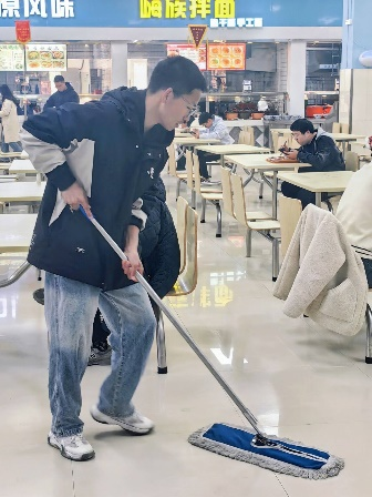 正值初春雷锋月,志愿服务我先行。活动进行过程中志愿者们一丝不苟、尽职尽责,杂乱的餐具在他们的整理下井然有序,肮脏的地面在他们的助力下重焕新颜。不辞劳苦的他们树立了志愿服务的良好榜样,收获了食堂工作人员的一致好评。