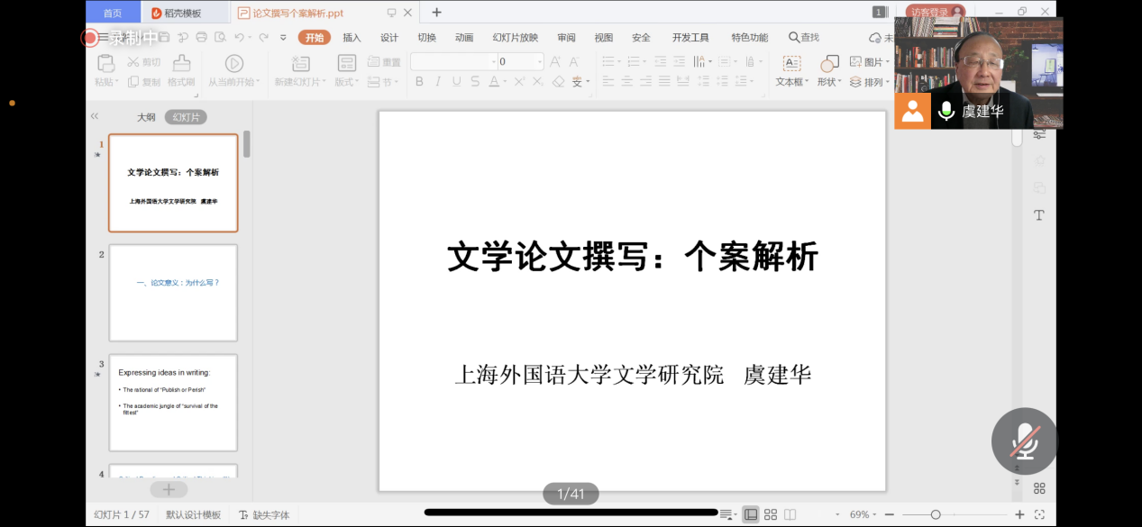 (通讯员:黄皓亮 金梓轩)2021年11月25日下午14:00,beat365平台官方网站“南望今声”外语论坛系列讲座如期召开。上海外国语大学文学研究院的虞建华教授应邀为我院师生做题为“文学论文撰写:个案解析”的讲座。本次讲座采取了线上腾讯会议直播的形式,我院共140余名师生参与学习交流。