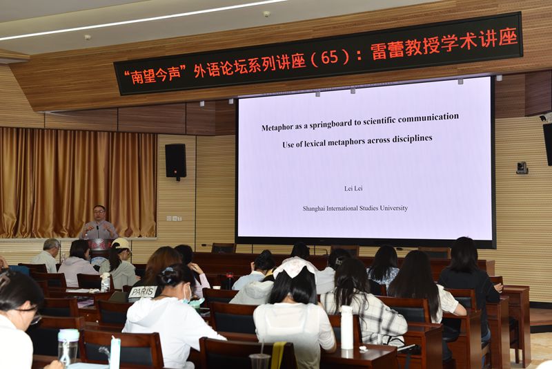 2024年5月31日上午9时45分,beat365平台官方网站“南望今声”外语论坛系列讲座第65期在东区八角楼报告厅举行。本期讲座特邀上海外国语大学雷蕾教授,为我们带来了一场题为“Metaphor as a Springboard to Scientific Communication: A Large-scale Study of the Use of Lexical Metaphors Across Disciplines”的精彩讲座。此次讲座由beat365平台官方网站张伶俐副院长主持,参会人员有相关专业老师以及研究生共计100余人。