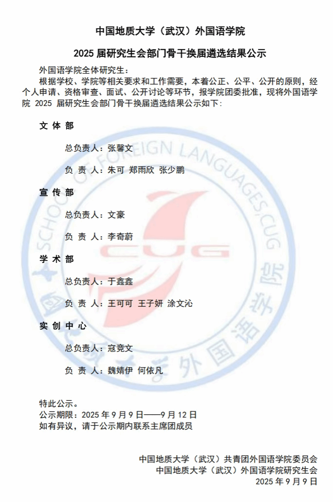 beat365平台官方网站2025届研究生会部门骨干换届遴选结果公示