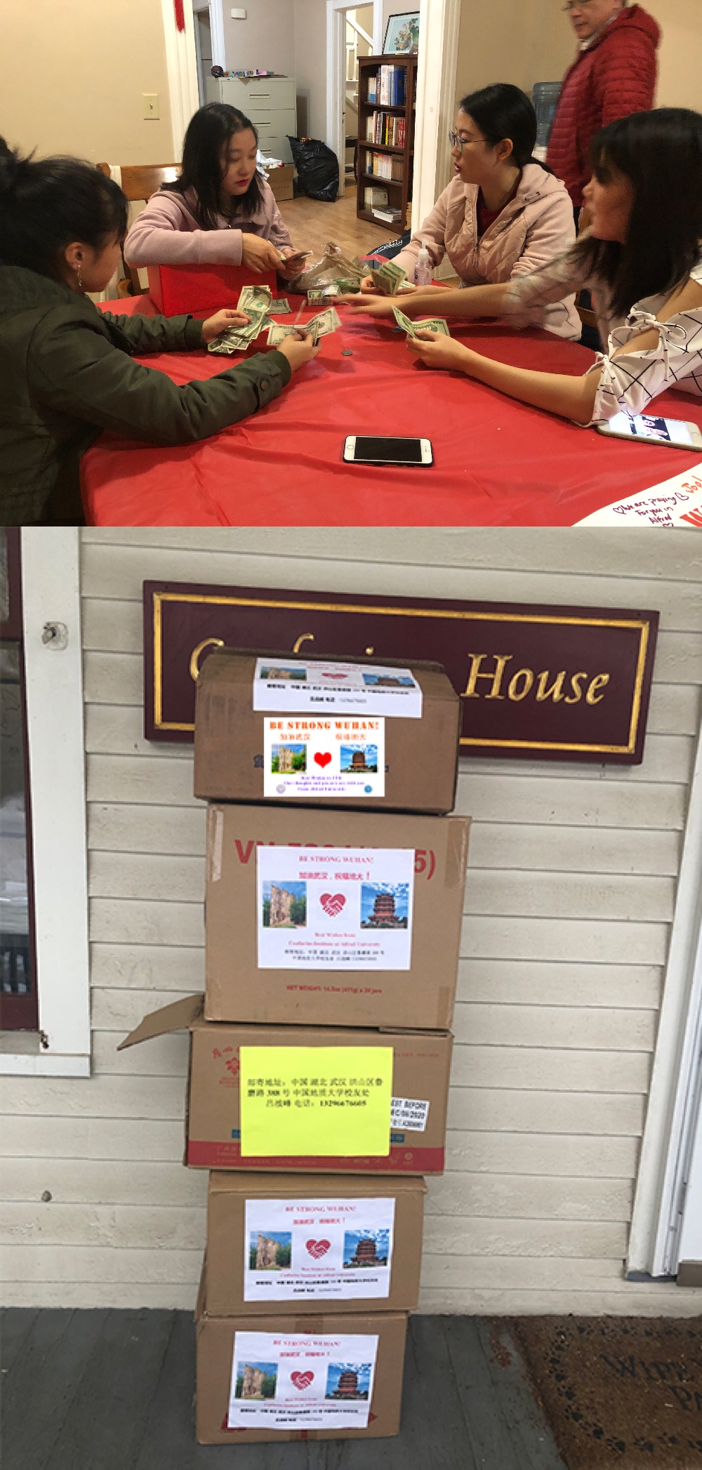 为了能够购买更多的医用物资,我们商量后决定再向阿尔弗莱德大学以及周边社区发起捐款的活动。于是我开始搜集各种资料,制作了一个“武汉加油”的视频以及一张签名海报,在一个晚会活动上,我们给来参加活动的教职工、学生和社区居民播放了视频,并向观众们介绍了武汉人们众志成城、抗击疫情的情况,讲述了地大(武汉)教职工积极努力,支持帮助近500名国际学生的生动事迹。