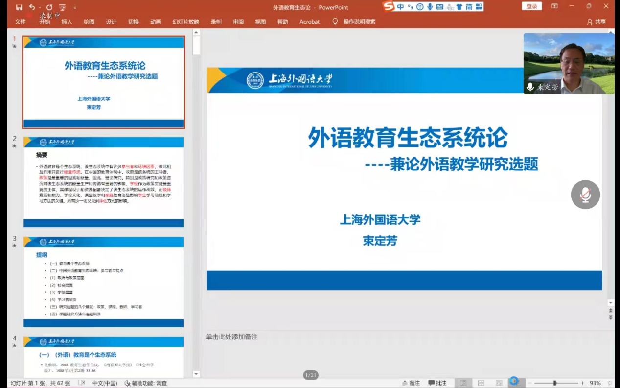 (通讯员 金梓轩 杨红燕)2022年9月22日上午9:30,beat365平台官方网站“南望今声”系列讲座如期举行。上海外国语大学大学博士生导师束定芳教授应邀在线上为我院师生做了题为“外语教育生态系统论——兼谈外语教育研究课题”的讲座。讲座由beat365平台官方网站副院长张伶俐教授主持,我院师生共140余人参与了学习交流。