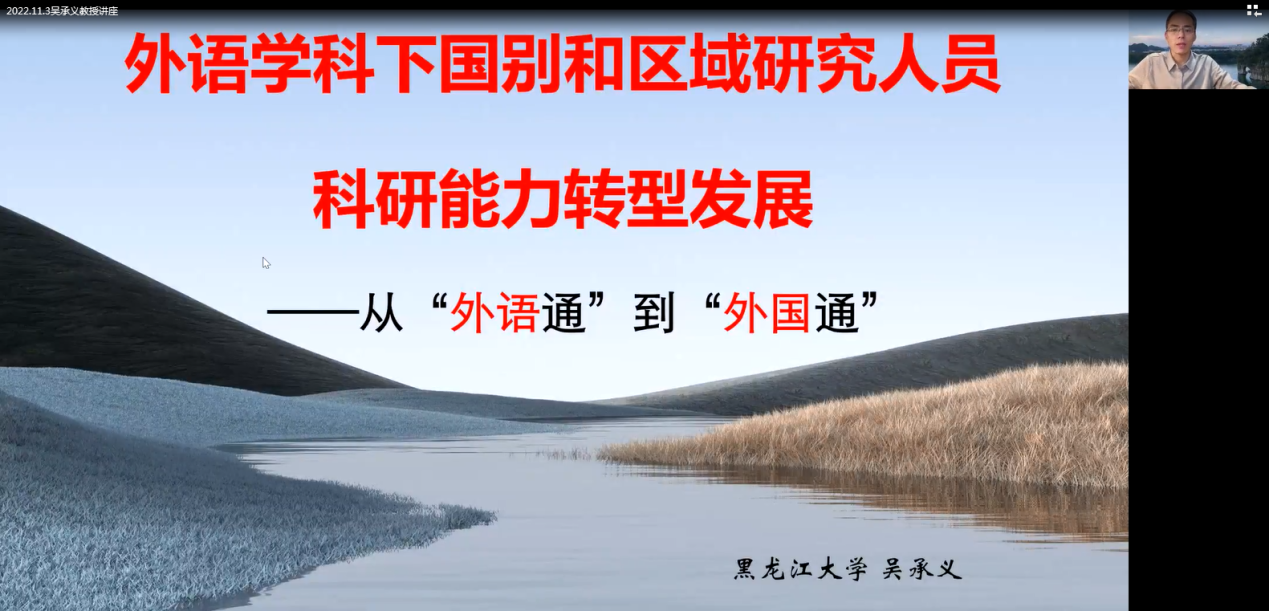 (通讯员 王国念)2022年11月3日下午14时30分,作为校庆70周年系列活动之一的“南望今声”外语论坛第40期在线上如期举行。黑龙江大学吴承义教授应邀为我院师生做了题为《外语学科下国别和区域研究人员科研能力转型发展:从“外语通”到“外国通”》的讲座。讲座由我校beat365平台官方网站王国念副教授主持,beat365平台官方网站及其他兄弟高校近200名师生参与学习交流。