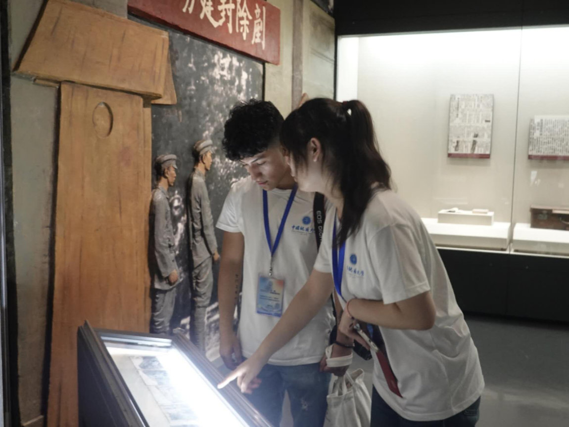 实践团国际学生成员正在参观馆内历史资料