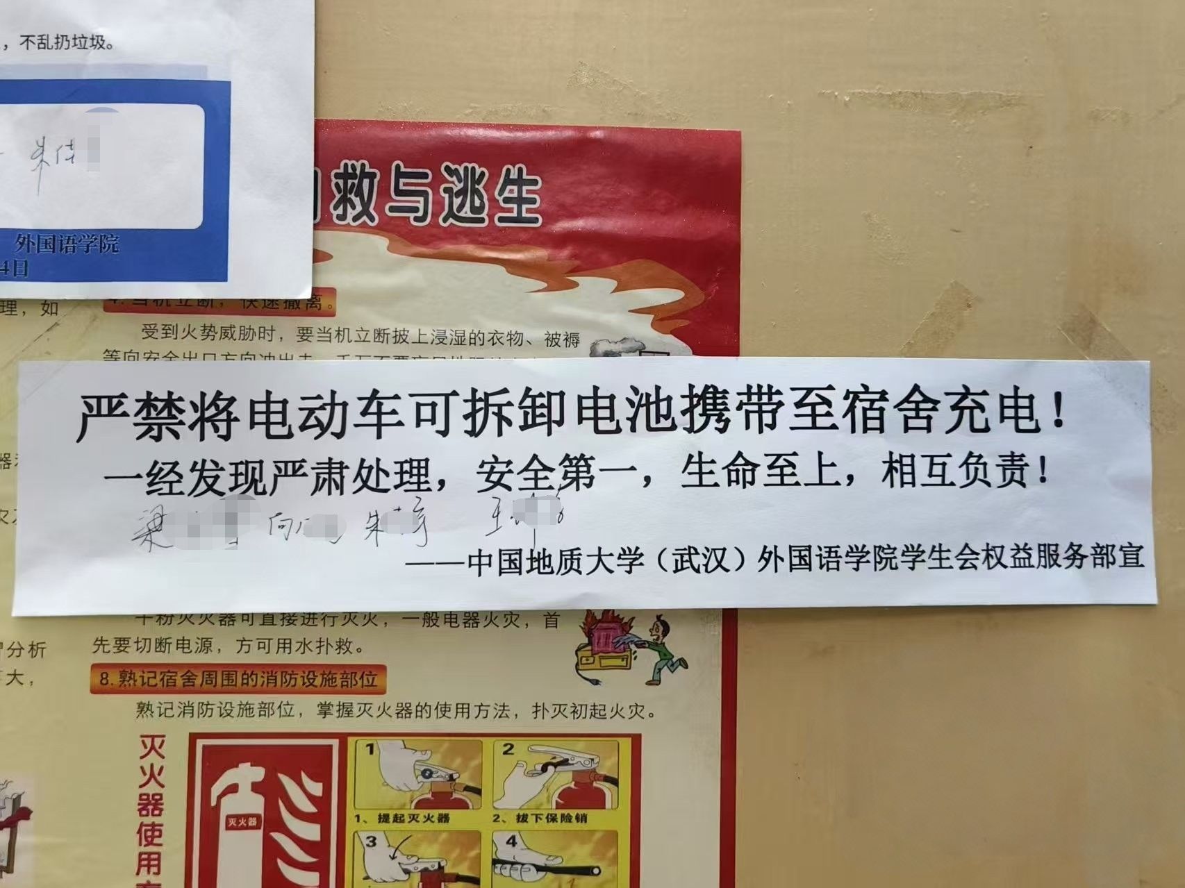 此外,学院特别制作电动车消防安全提示,以宿舍为单位开展电动车安全承诺接力活动。各宿舍集体学习电动自行车充电规范后,在提示条上签署姓名,实现安全责任“到寝到人”。