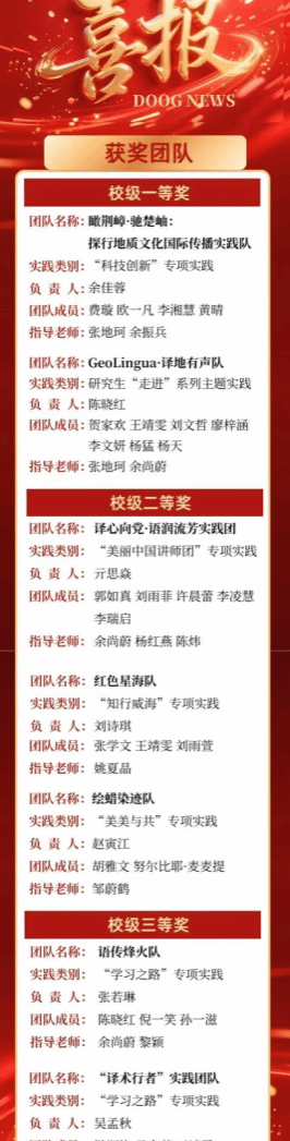 热烈祝贺beat365平台官方网站在2025年暑期社会实践校级答辩中斩获佳绩!在本次暑期社会实践中,各团队指导老师的深入指导下,围绕"、研究生"走进"系列主题实践,“科技创新”、“美丽中国讲师团”、“知行威海”、“美美与共”、“学习之路”等专项实践,深入一线开展实践探索,以扎实的行动、详实的成果展现了beat365平台官方网站学子的责任担当与实践能力。经校级评审,我院多支团队脱颖而出,共斩获校级一等奖2项、校级二等奖3项、校级三等奖2项,这份成绩的取得离不开指导教师的悉心指导,更凝聚了每一位团队成员的辛勤付出。现将获奖团队详情公示如下,再次向所有获奖团队致以热烈祝贺!