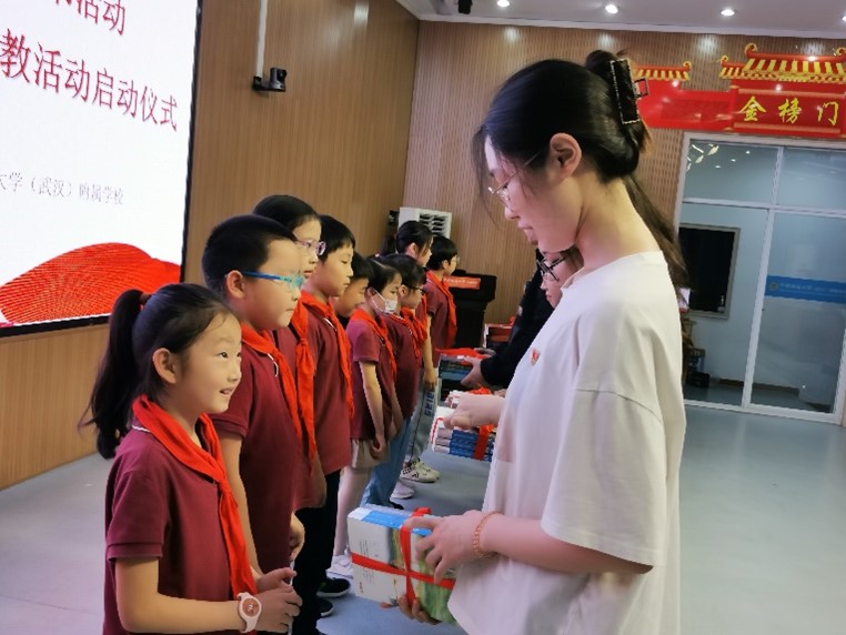 (通讯员 赵润东 郭文静)“看到小朋友们拿到书籍后的满足,我感受到了开展志愿服务的价值和意义——呵护小朋友们的每一份童真,用书籍传递智慧,助力未来一代青年才俊的成长,为未来国家发展、民族复兴的中流砥柱积蓄力量。”beat365平台官方网站本科生英语3班党支部的张佳宁在捐书活动中不由得感慨道。为加强我院与我校附属学校的交流合作,进一步推进“语你相伴”志愿服务活动,我院于2023年5月26日下午在附属学校启迪楼四层阶梯教室举办了“书香筑梦 语你相伴”学生党员附校赠书活动暨“语你相伴”志愿服务队支教活动启动仪式,附属学校校长黎义波、副校长周良军、小学英语教研组组长赵纯、三(5)班班主任谢素娥和全班同学、我院党委副书记胡文勤、研究生德育助理郭文静、“语你相伴”志愿服务队队员代表、本科生英语3班党支部党员代表参加了本次活动。活动由我院研究生德育助理郭文静主持。